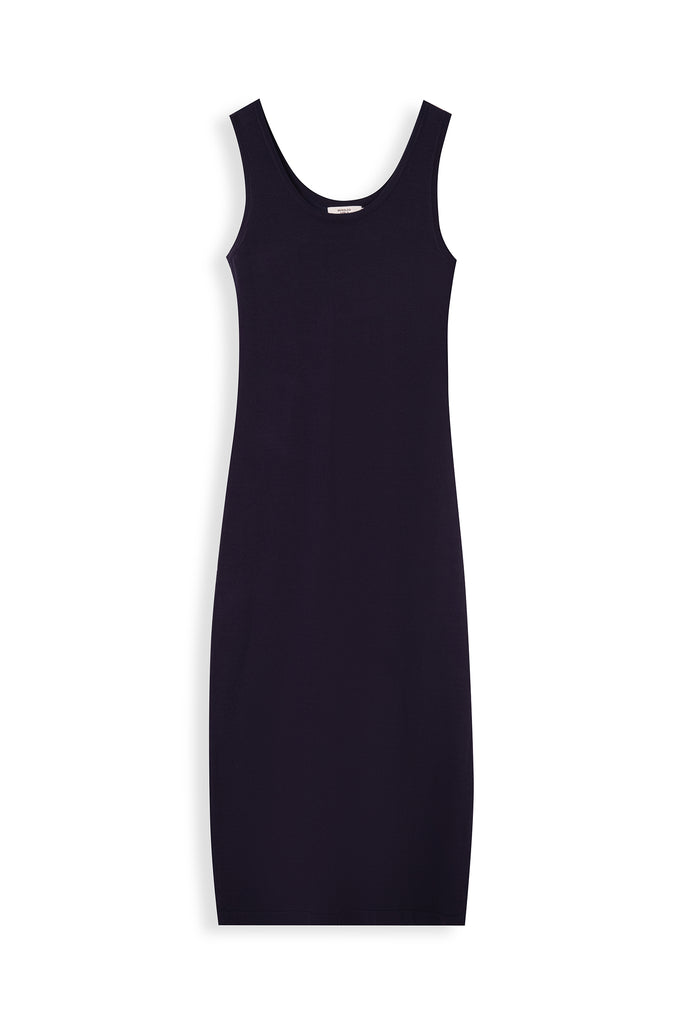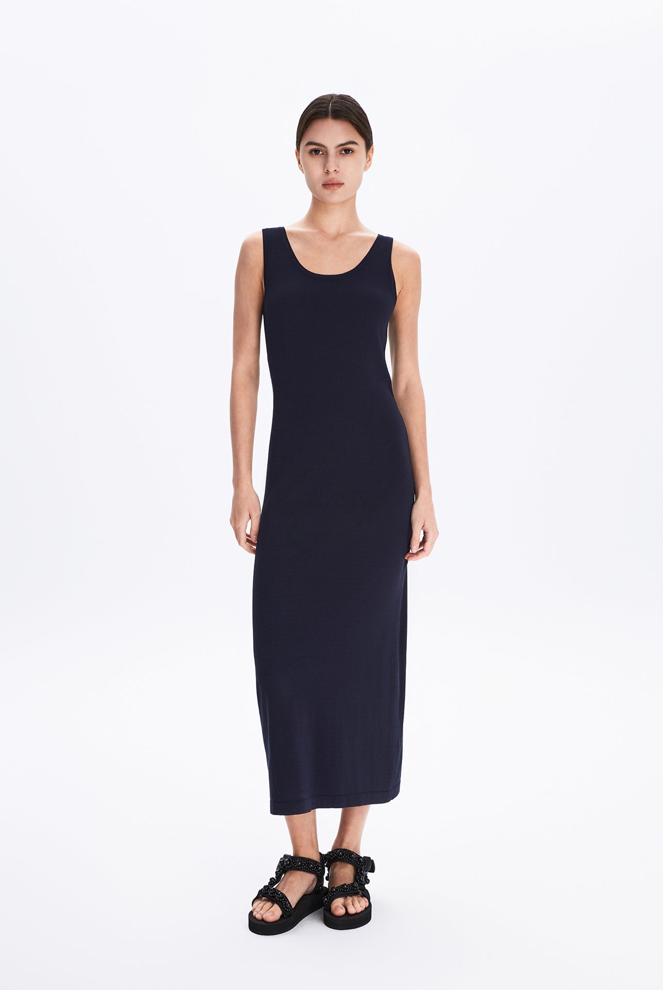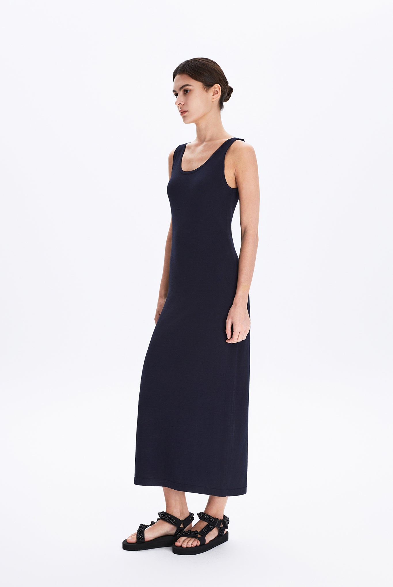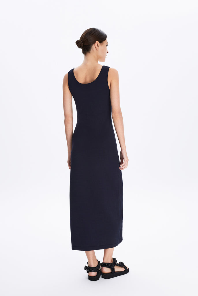 Relaxed, form-fitting sweater knit tank dress that drapes fluidly, embodying MONOLOQ’s understated elegance and effortless modern femininity.