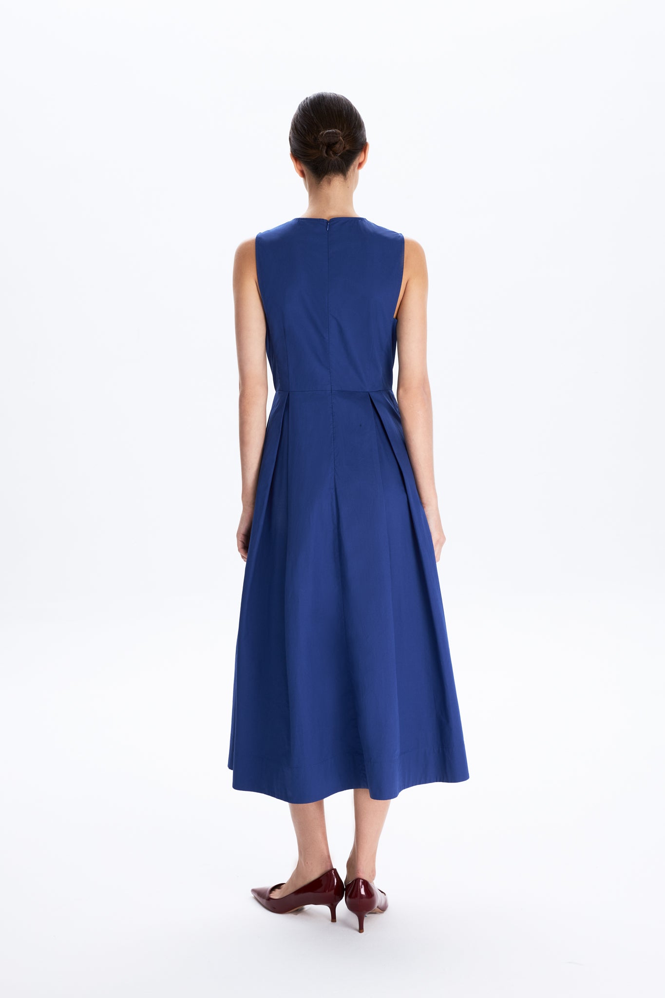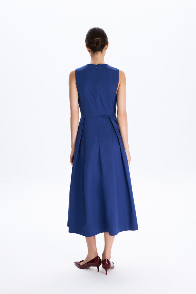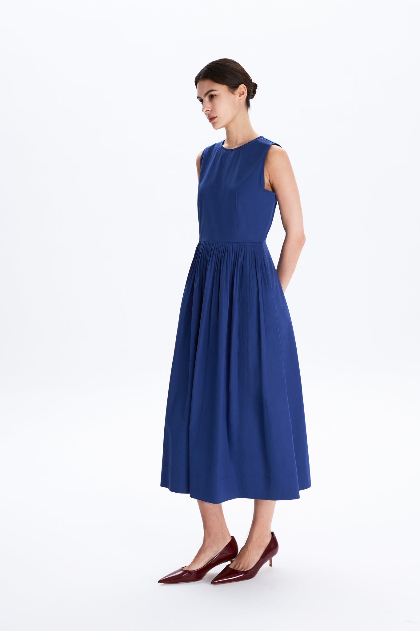 A timeless silhouette infused with graceful movement. This fit-and-flare dress features delicate front pleats that add volume and fluidity to its structured bodice. Defined at the waist, it falls into a softly gathered skirt that moves beautifully.