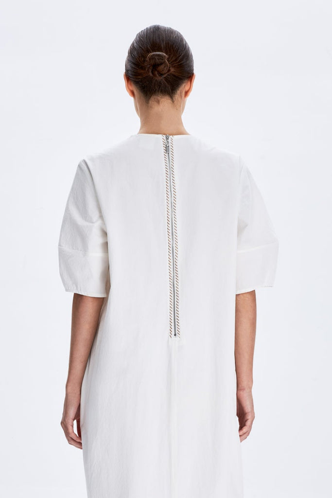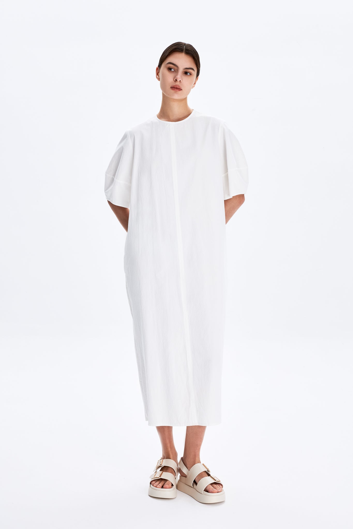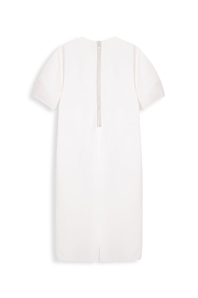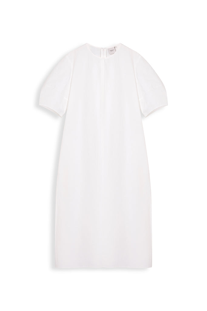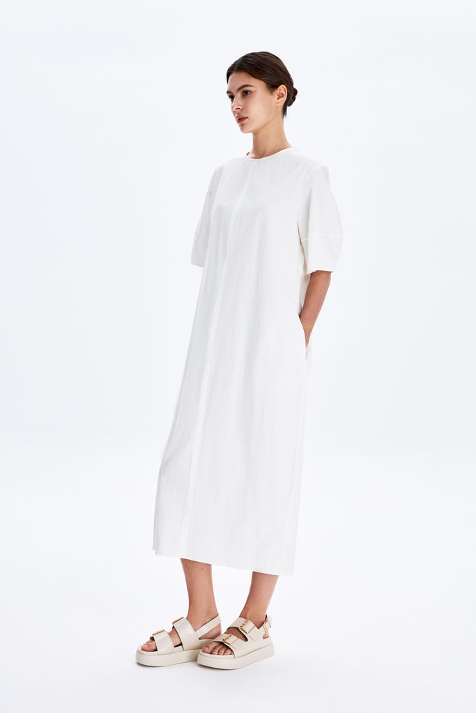 This is a minimalist, knee-length dress with a clean, structured silhouette. It features short, slightly puffed sleeves for a touch of volume and a round neckline that enhances its simplicity. It's ideal for a fresh, polished look and perfect for casual or semi-formal wear.