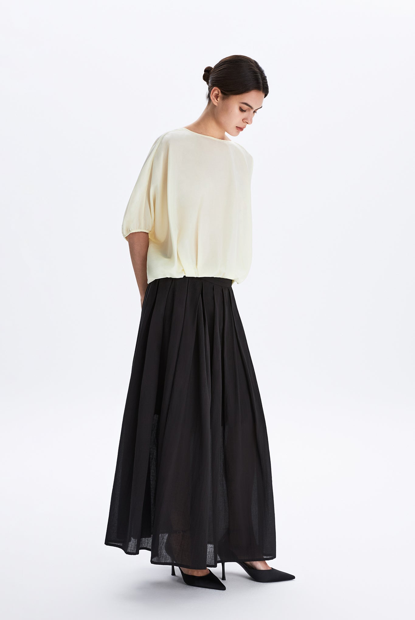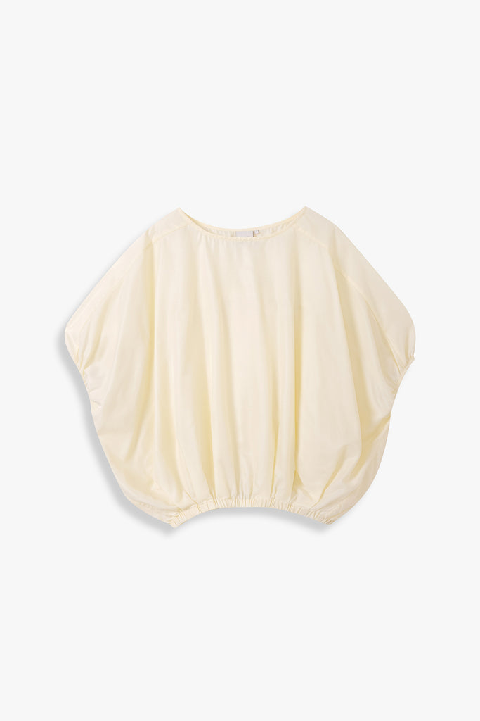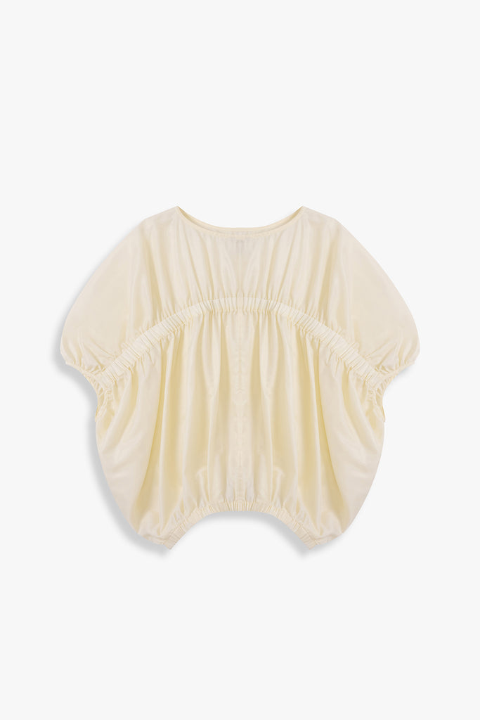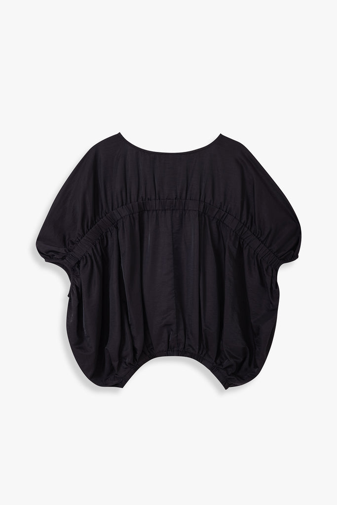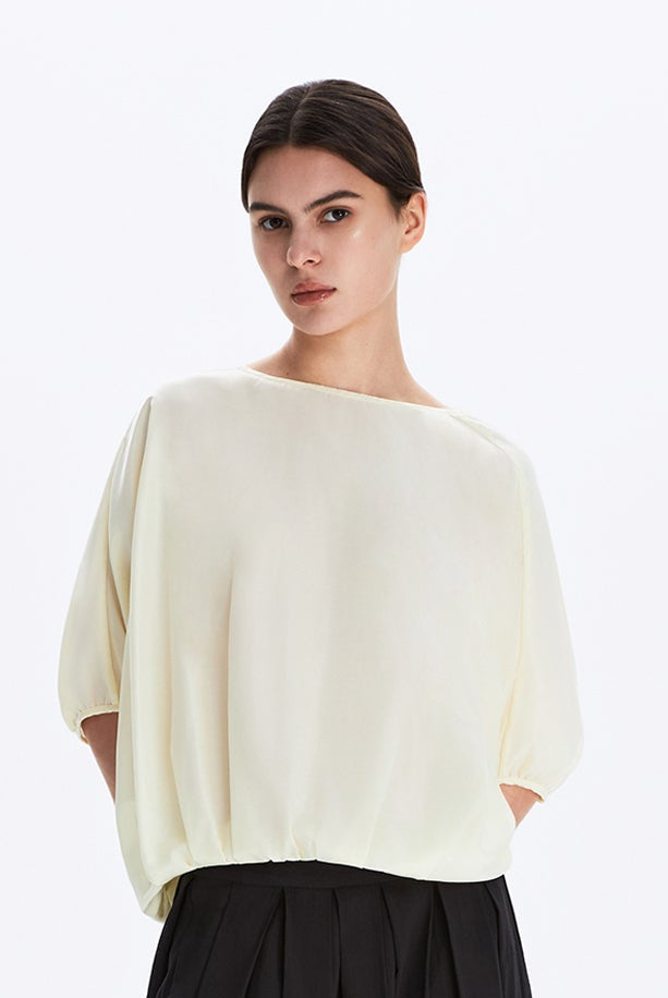 A relaxed silhouette with effortless charm. This round-neck top features a softly draped shape with gathered details at the hem, creating gentle volume and movement. Designed for comfort and versatility, it pairs easily with both structured and casual pieces for a refined yet laid-back look.