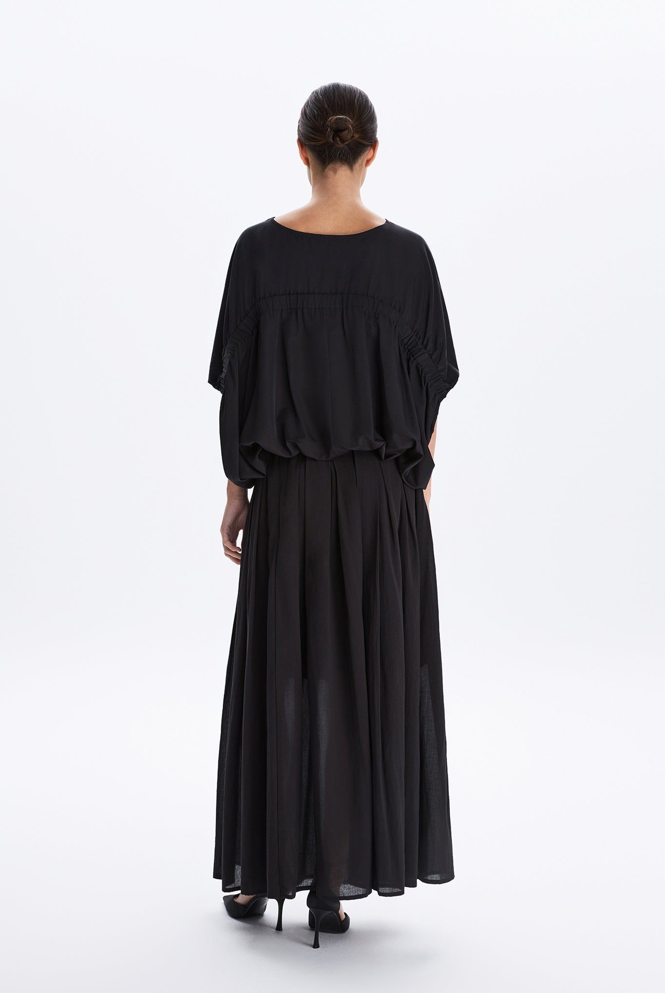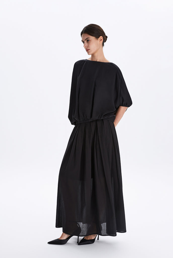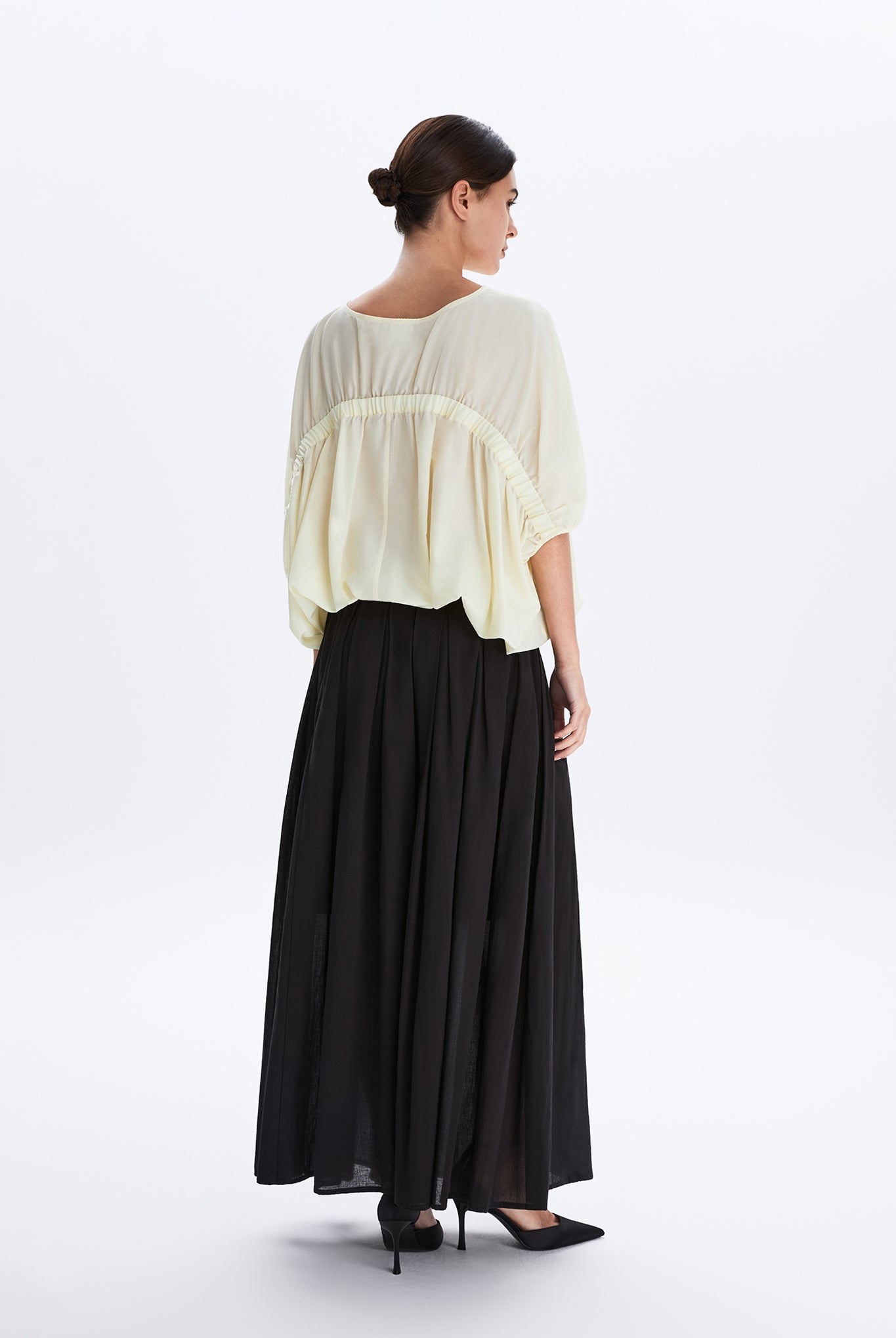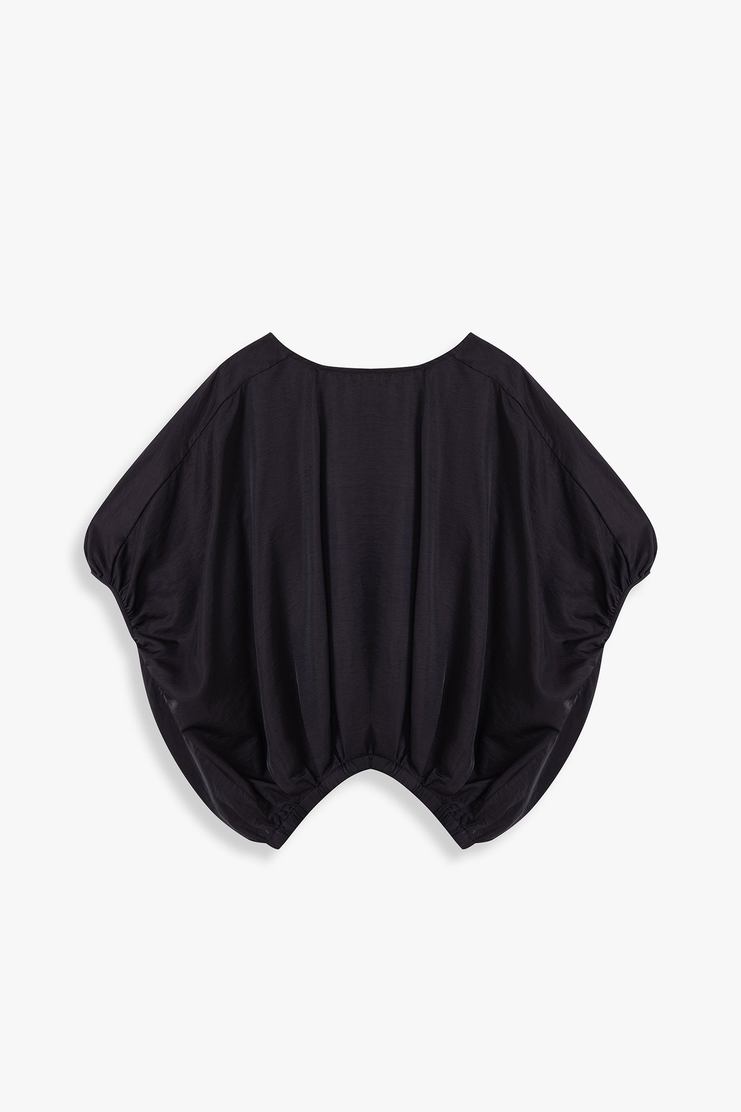 A relaxed silhouette with effortless charm. This round-neck top features a softly draped shape with gathered details at the hem, creating gentle volume and movement. Designed for comfort and versatility, it pairs easily with both structured and casual pieces for a refined yet laid-back look.