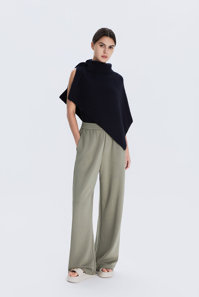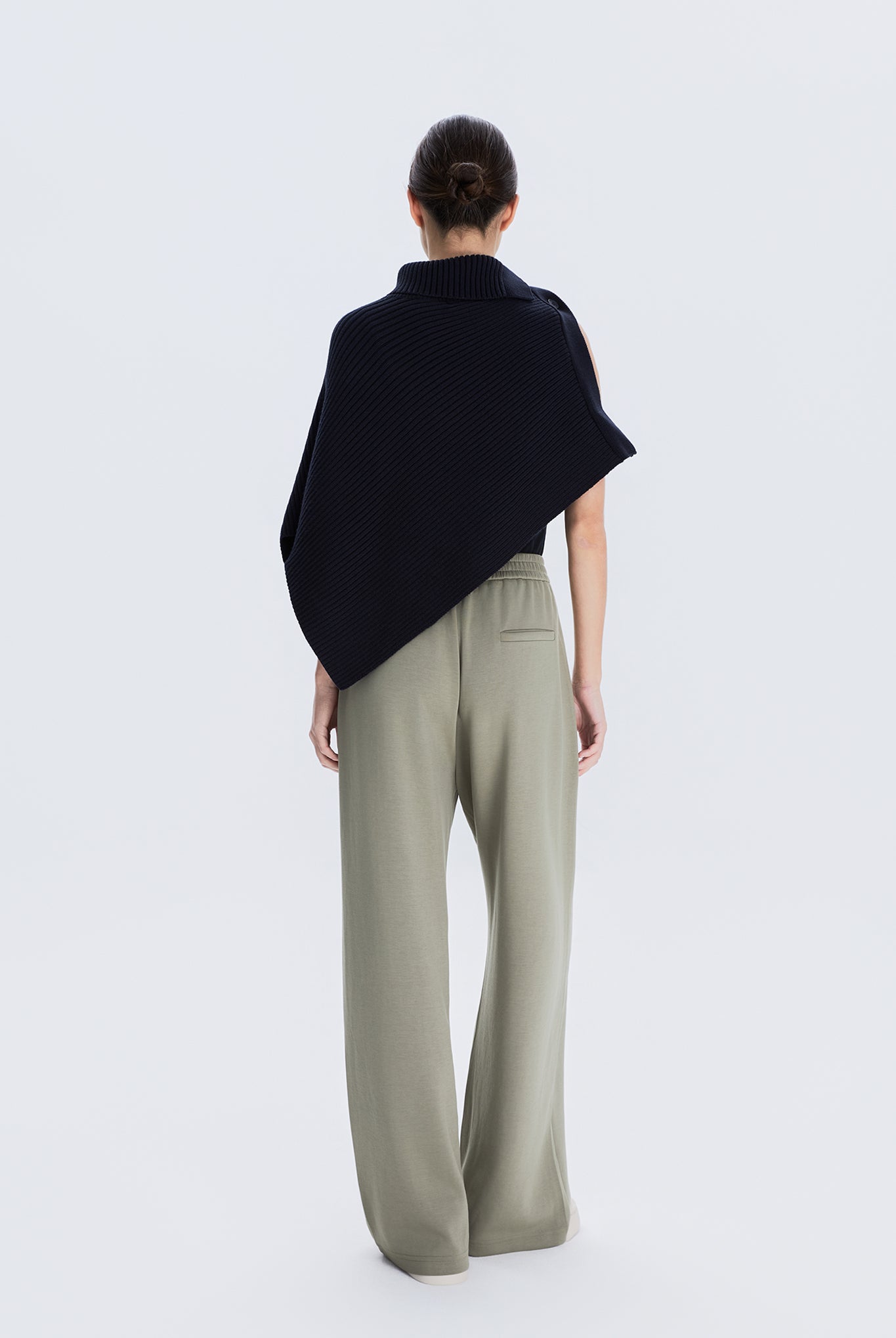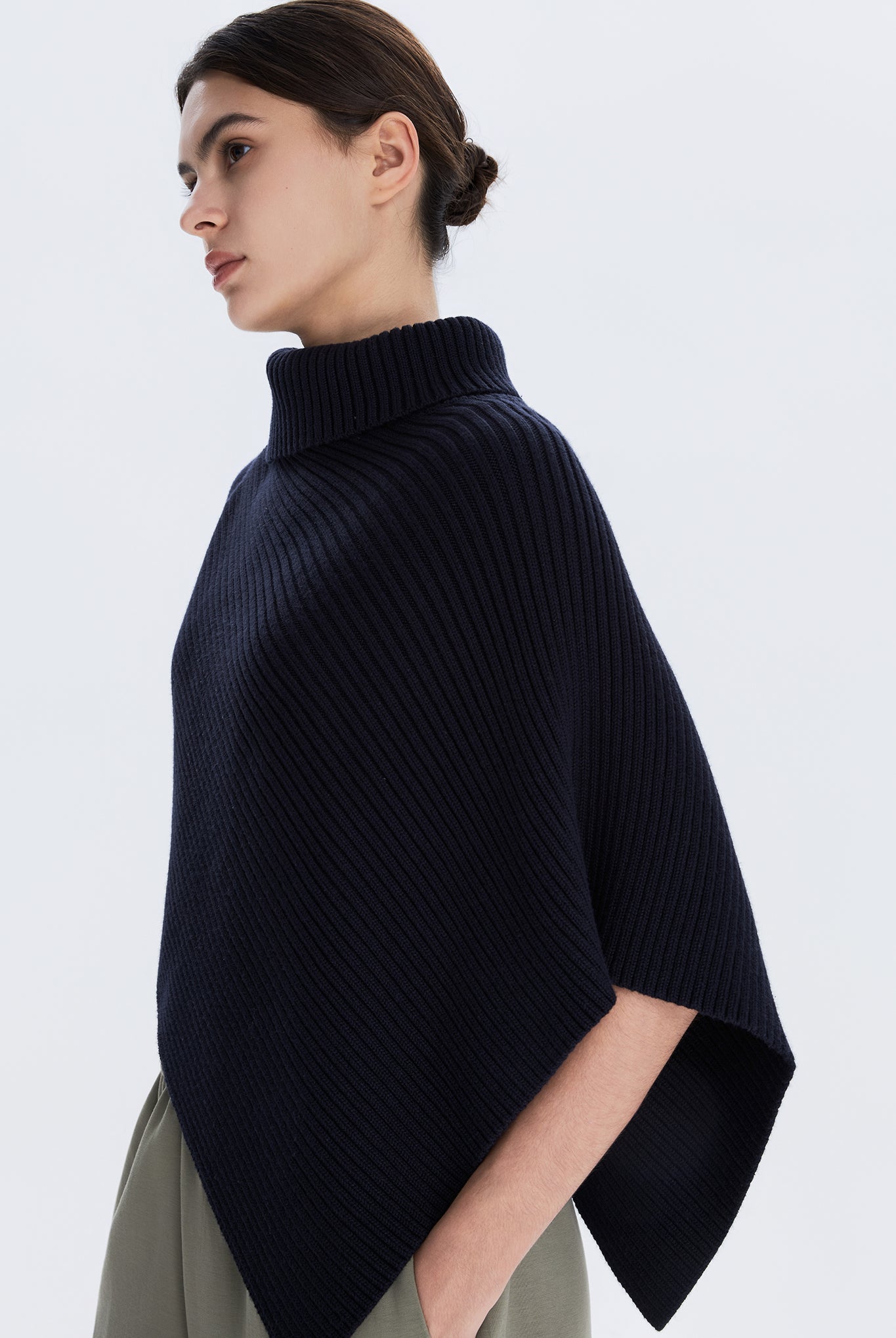 Asymmetric knit cape with ribbed texture, button fastening at shoulder, draped silhouette, effortlessly modern.