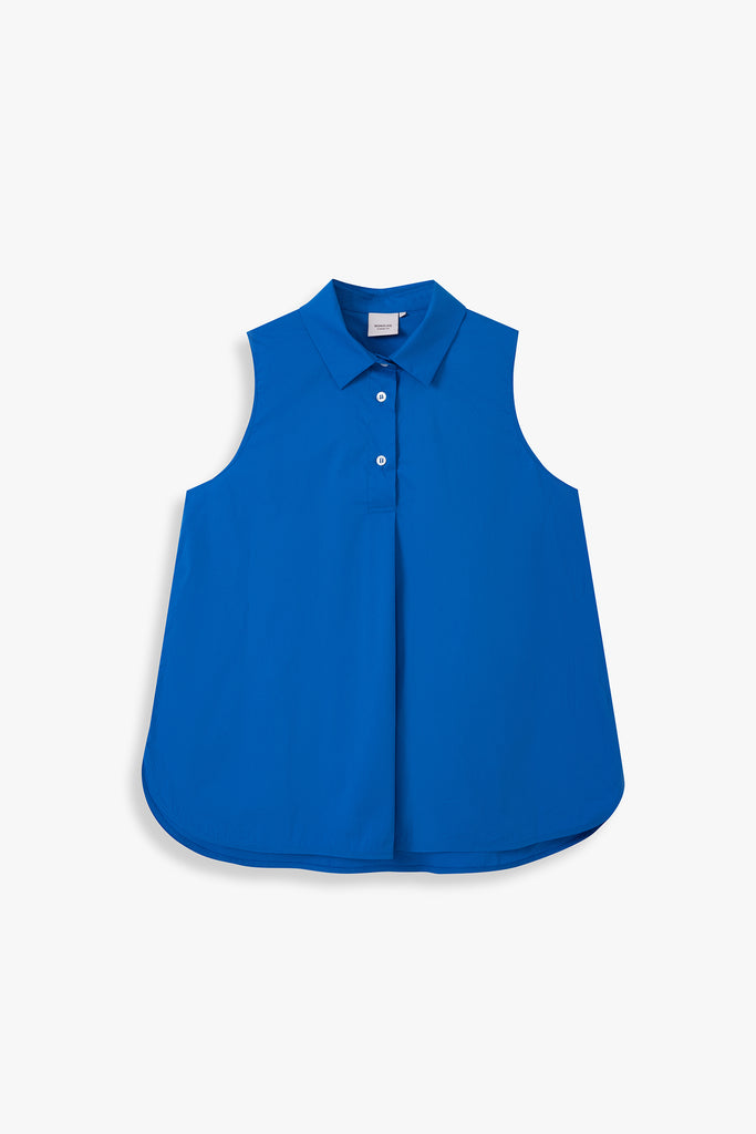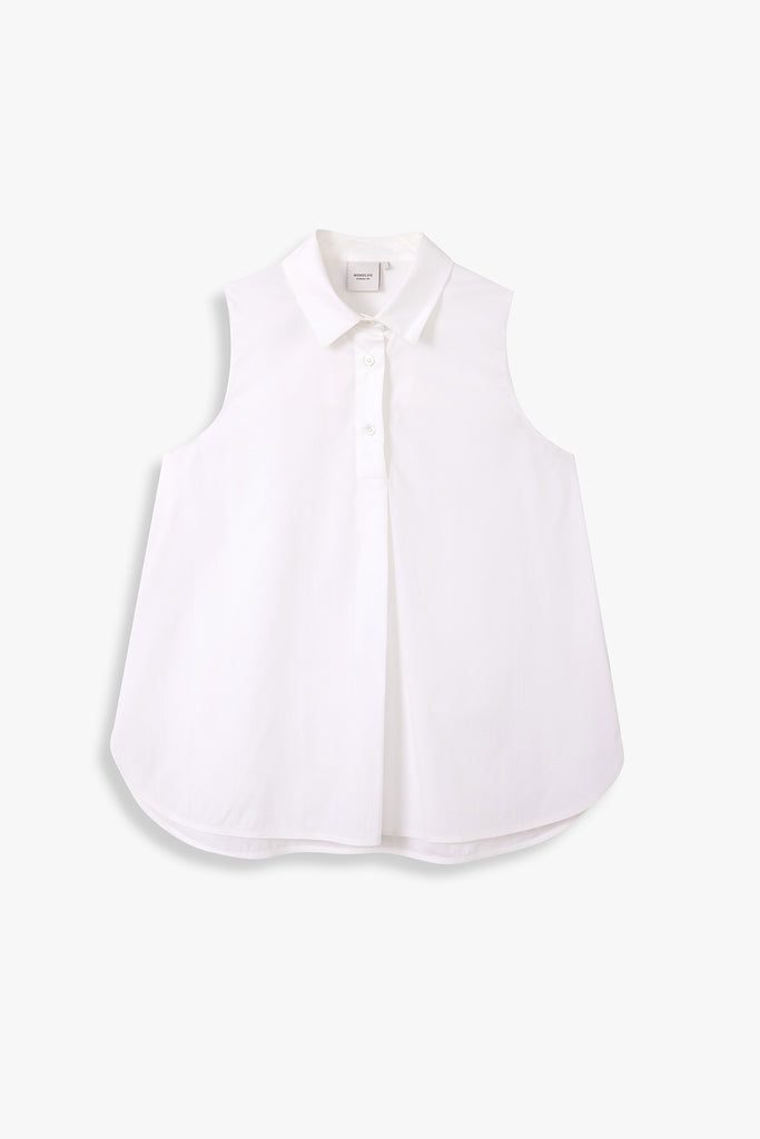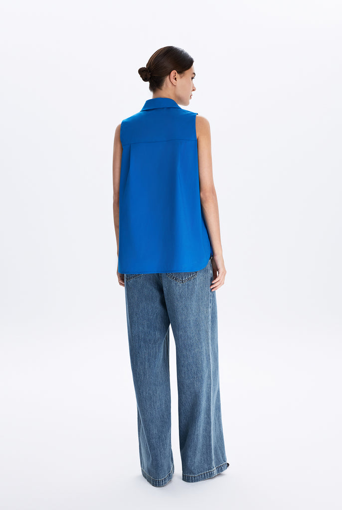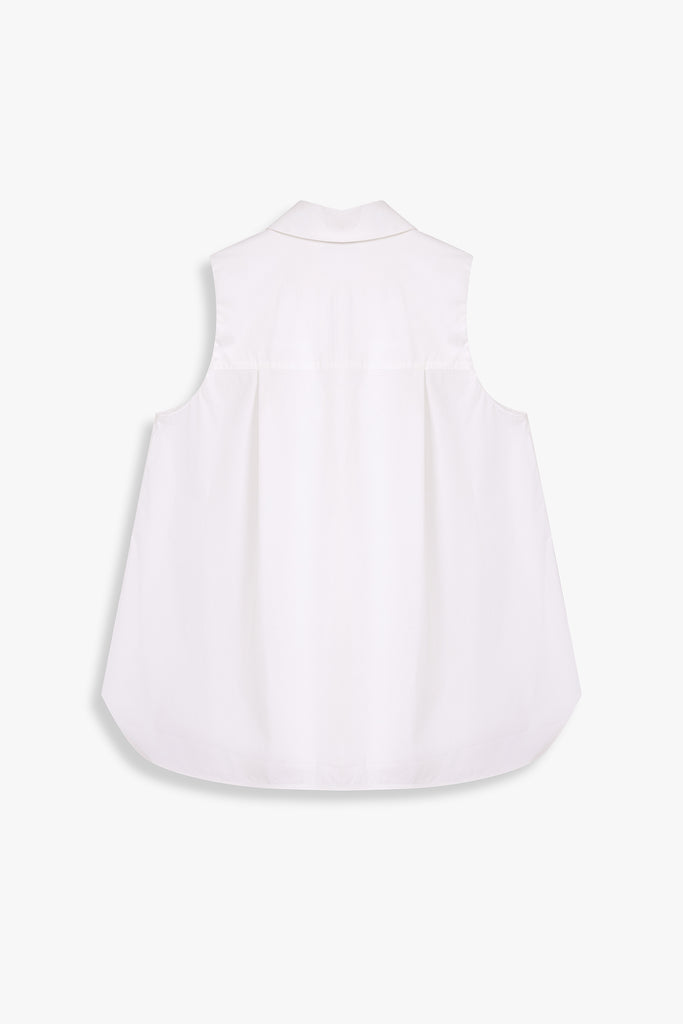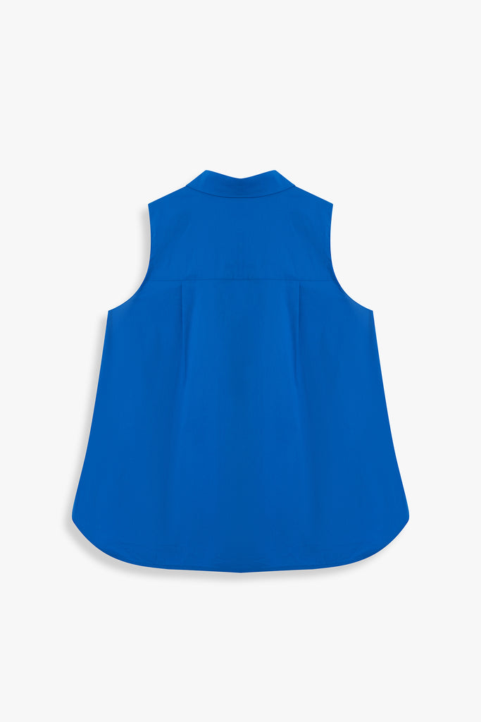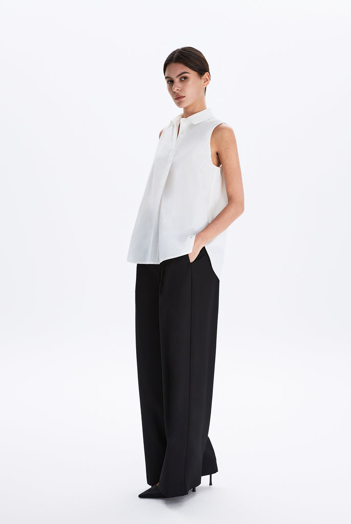 This sleeveless collared shirt features a softly flared silhouette that enhances its effortless drape. Designed for both ease and polish, it transitions seamlessly from weekday tailoring to relaxed weekend styling.