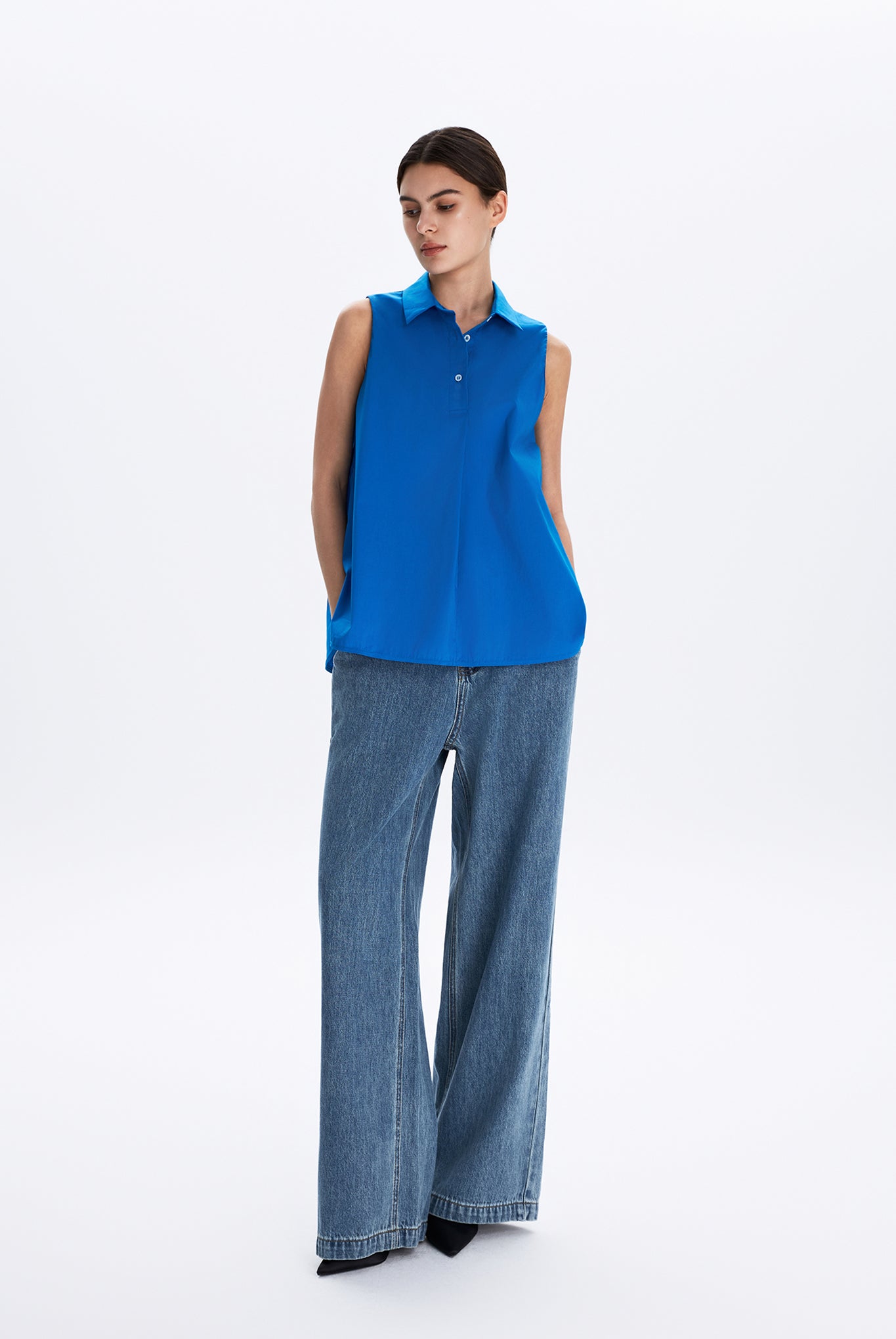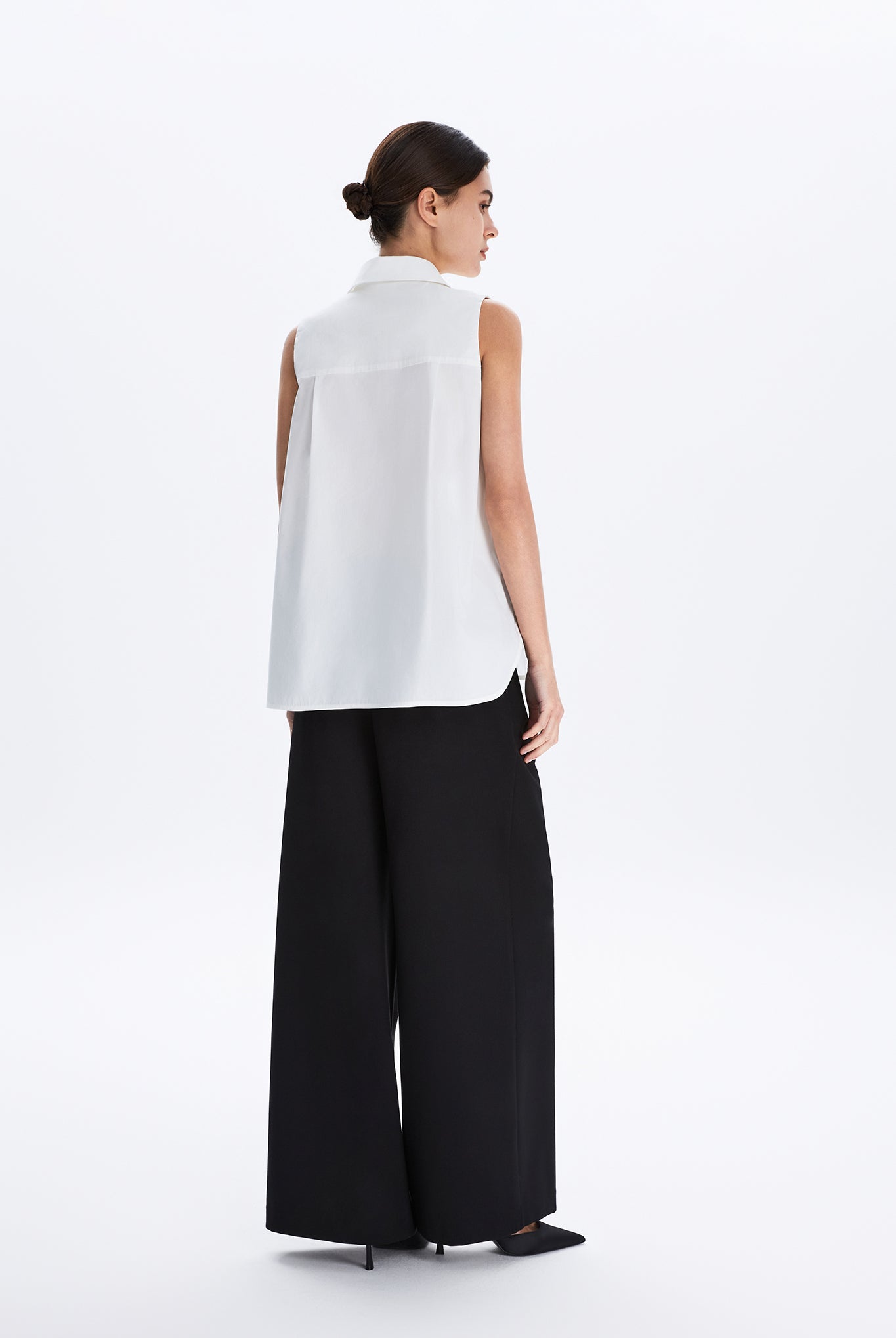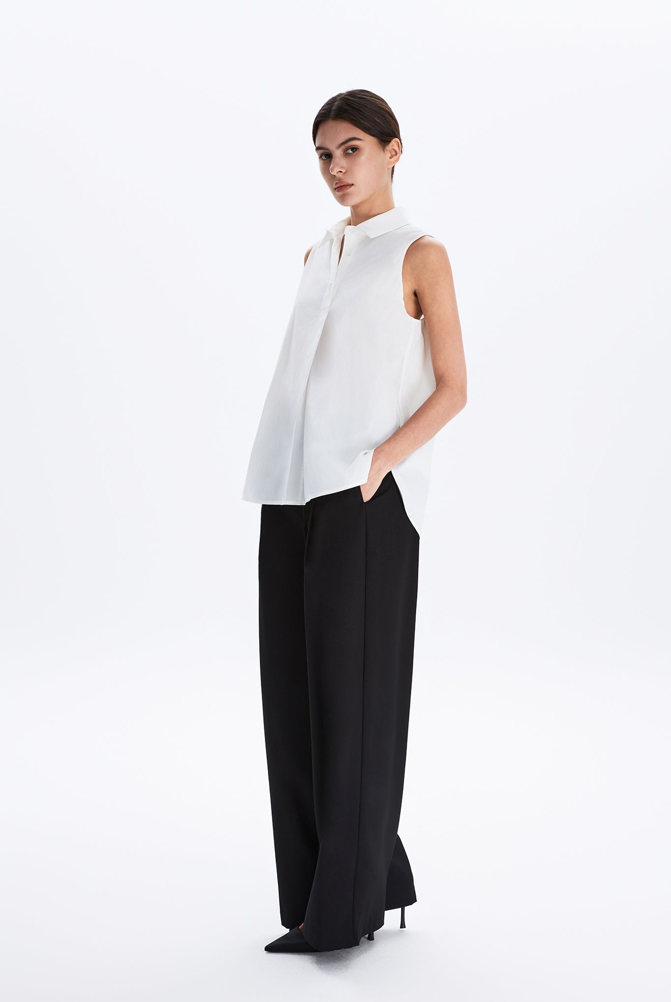 This sleeveless collared shirt features a softly flared silhouette that enhances its effortless drape. Designed for both ease and polish, it transitions seamlessly from weekday tailoring to relaxed weekend styling.