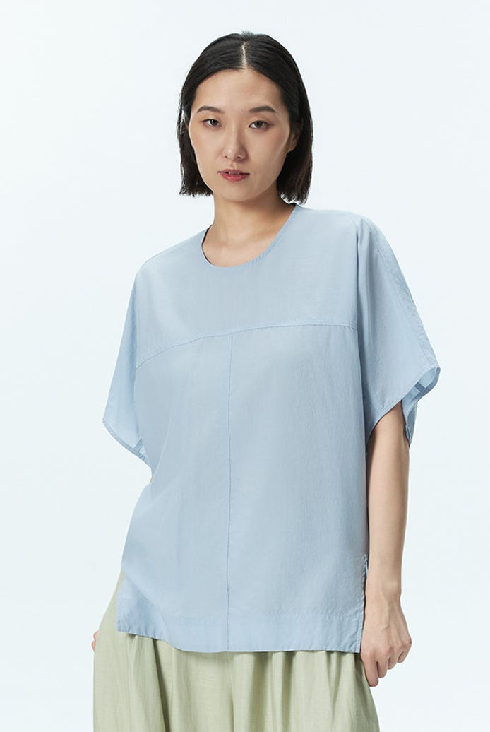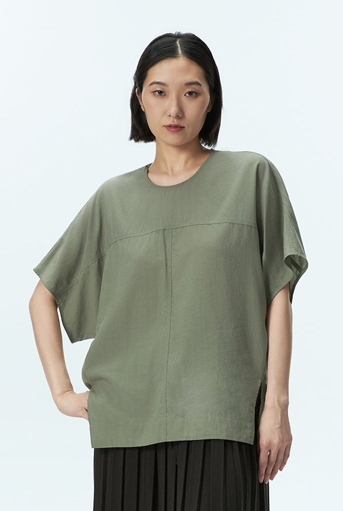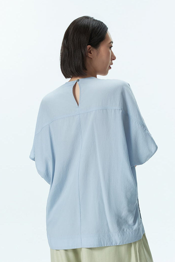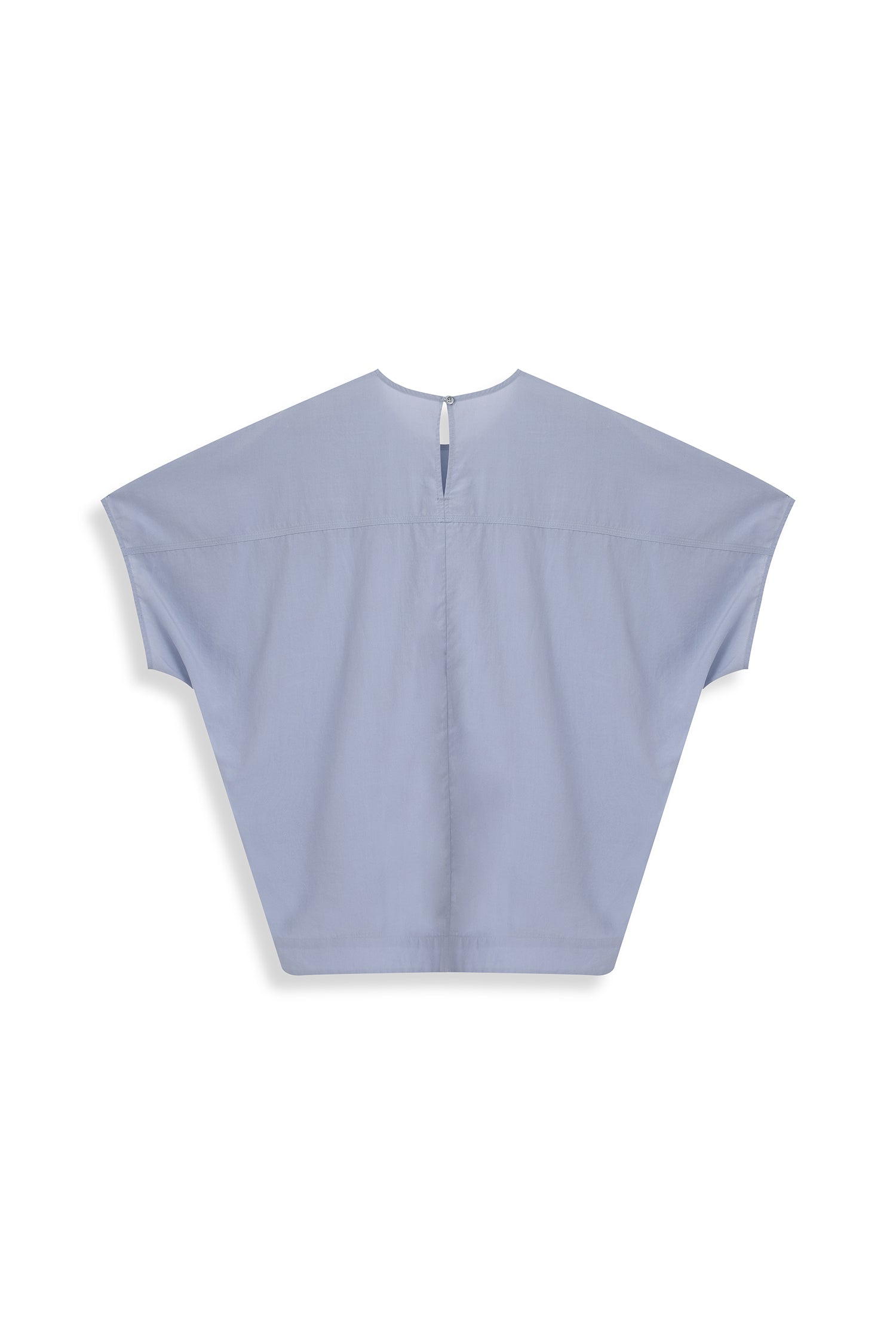 A stitch detail top featuring subtle seam accents and a back button opening, designed with a modern silhouette and a refined touch of detail.
