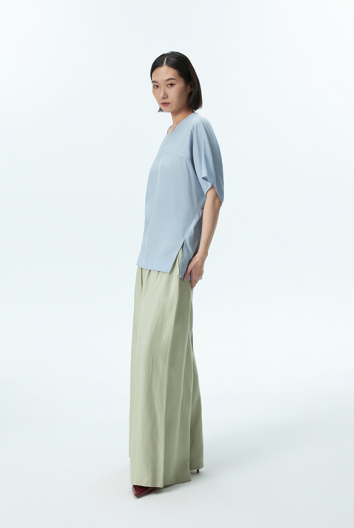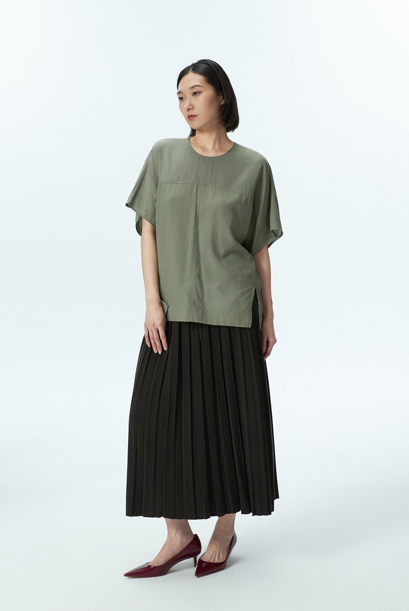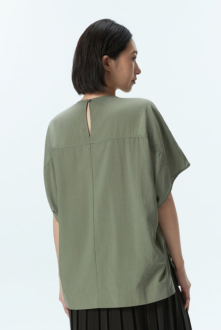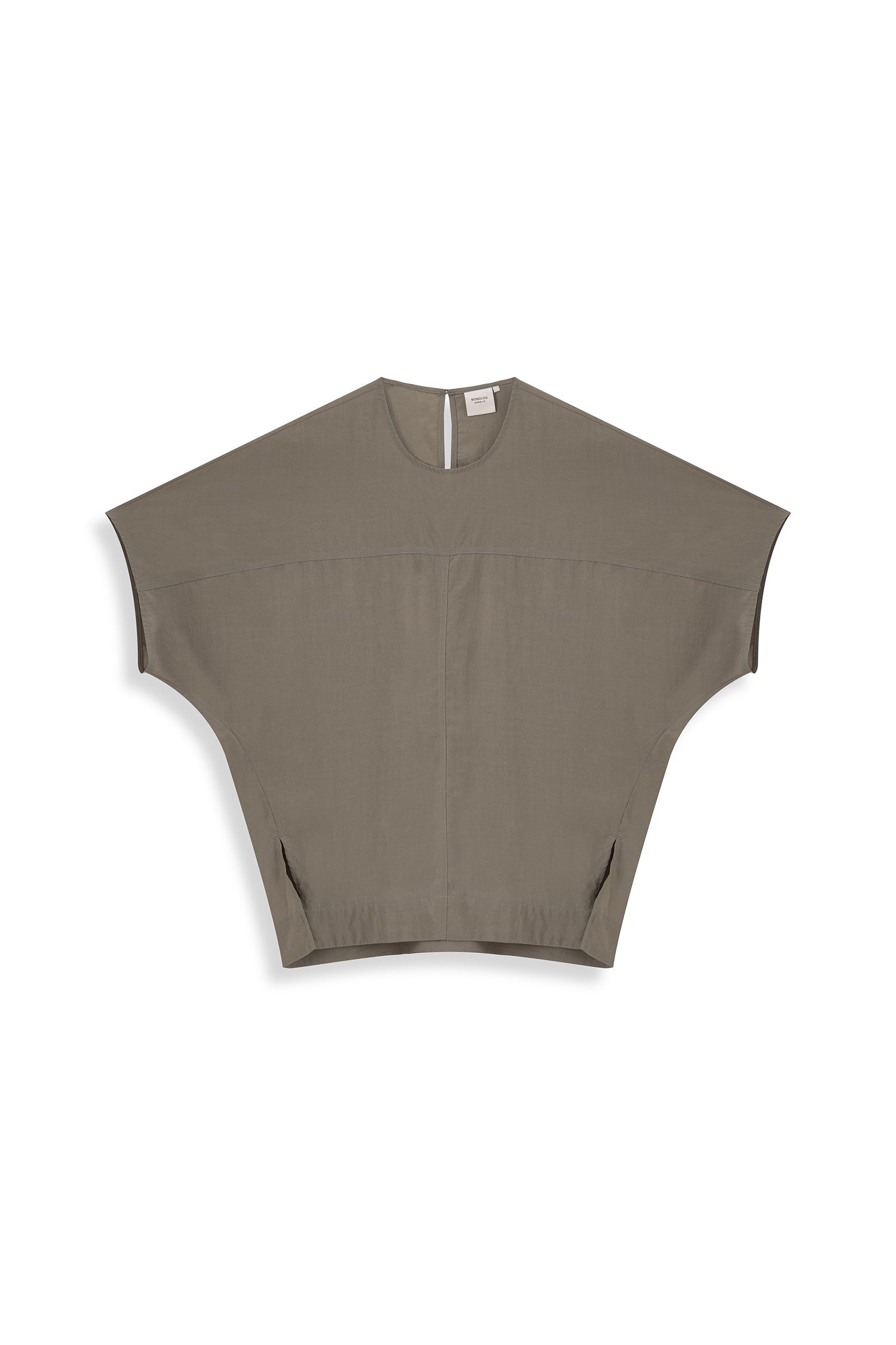 A stitch detail top featuring subtle seam accents and a back button opening, designed with a modern silhouette and a refined touch of detail.