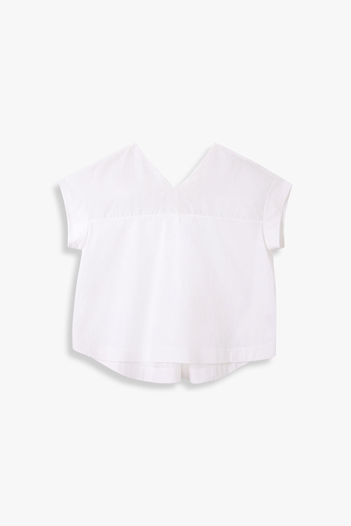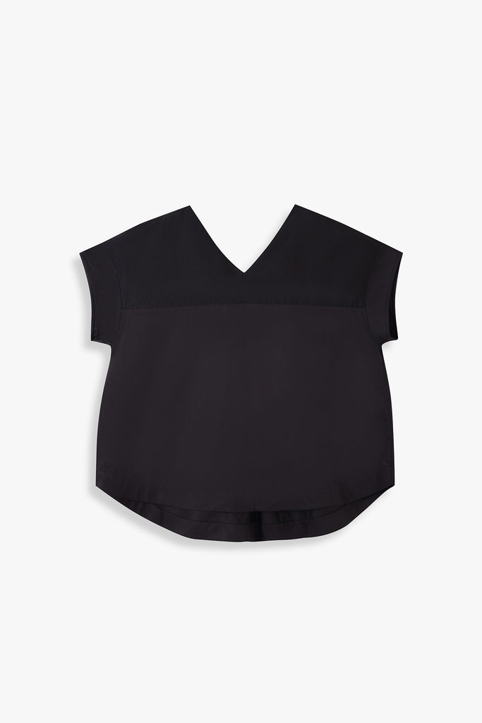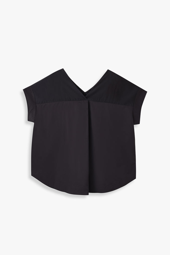 A contemporary top defined by contrast and ease. This V-neck style combines two subtly different fabrics, creating a tonal play of texture and sheen. The relaxed silhouette and dropped shoulders enhance its effortless appeal, while the clean lines make it a versatile piece.
